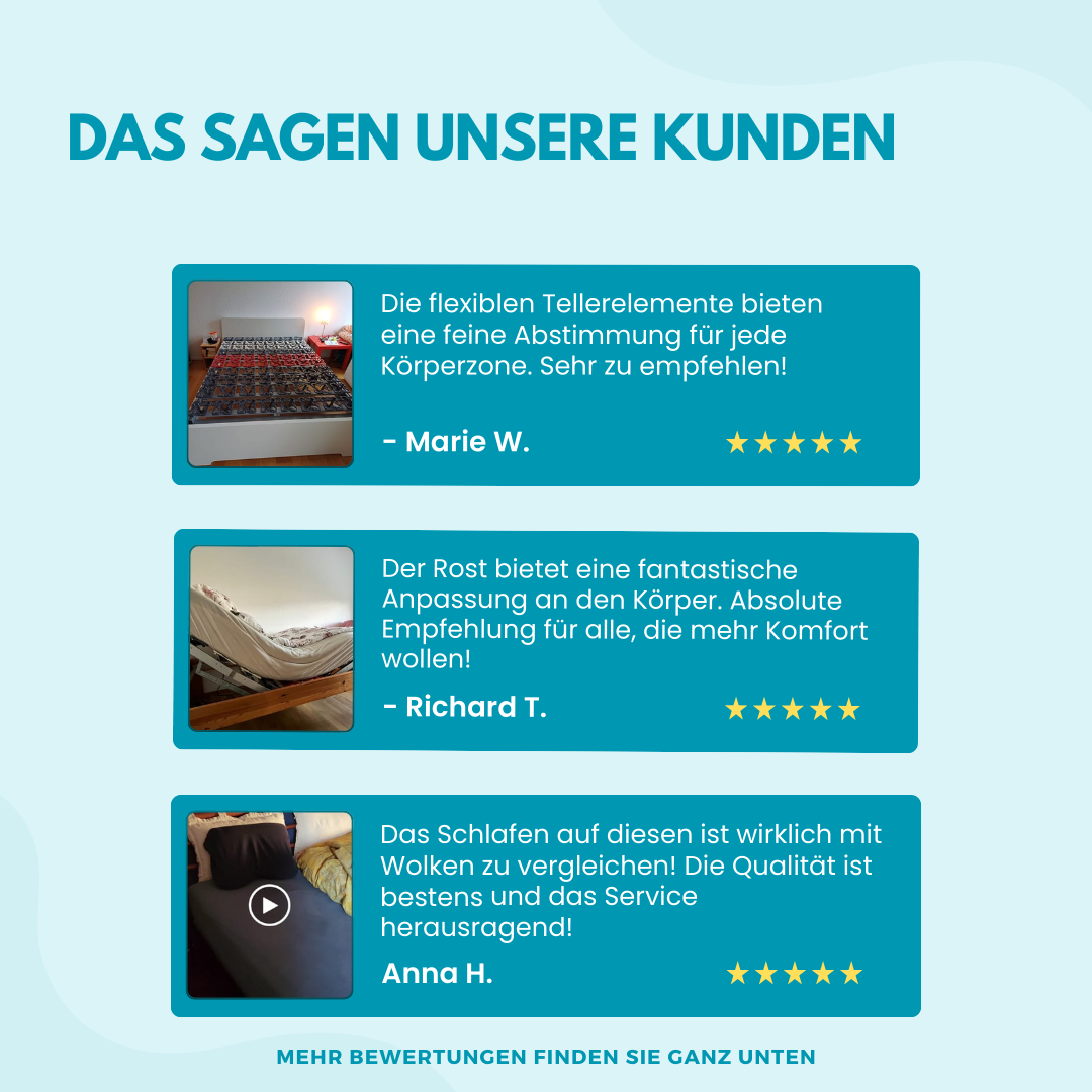 Mit dem Tellerrost LuxusPro schaffst du die idealen Bedingungen, damit dein Körper entspannen und dein Geist wirklich zur Ruhe kommen kann. Jede Nacht wird zu einer spürbaren Pause vom Alltag und jeder Morgen beginnt mit mehr Leichtigkeit, Energie und Lebensqualität.